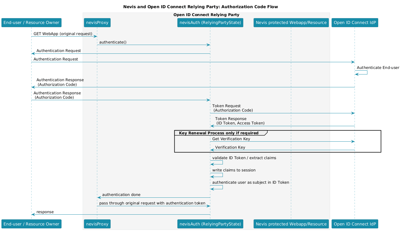 The AuthState RelyingPartyState implements the authorization code flow and can be used to implement login in a Nevis-protected web application via an OpenID Connect identity provider. This is achieved by configuring nevisProxy to intercept unauthenticated requests to the web application and requiring authentication by nevisAuth. A nevisAuth instance configured with the RelyingPartyState will issue an authentication request to the OpenID Connect provider via an HTTP redirect. The OpenID Connect provider will then require the end user to authenticate. If successfully completed, the provider will redirect the end user back to the relying party with an authorization code. Upon receipt of an authorization code, the RelyingPartyState will redeem it for an ID and access token at the provider. The ID token returned by the provider will then be verified by the RelyingPartyState, the user ID will be set to the subject claim in the ID token and further claims contained in the ID token will be propagated in the session. nevisAuth will respond to nevisProxy with AUTH_DONE and a SecToken, which nevisProxy can then delegate to the originally requested web application. This flow is also depicted in the following figure.